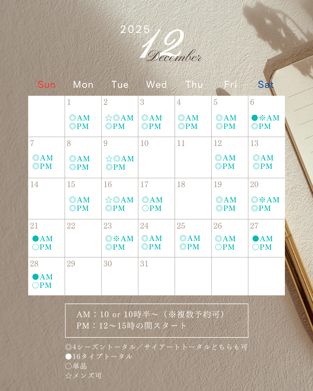 イメージコンサルティング12月分受付スタート! 2025.11.1 11/1(土)イメージコンサルティング12月分受付スタートいたしました。 ご予約は以下からお願いいたします。お待ちしております。 ご予約 ※11/1時点でのご予約状況です。予約状況は随時変わります。 Tweet Share Hatena Pocket RSS feedly Pin it イメージコンサルティング11月分受付スタート! 前の記事 講座受付開始(顔タイプアドバイザー1級認定講座 2025年12月,2026年1月… 次の記事